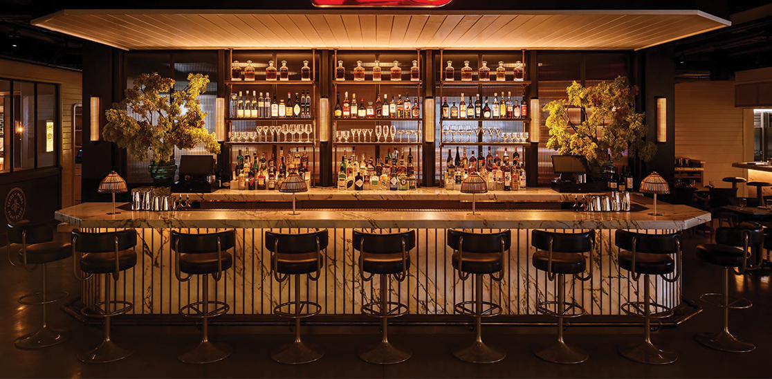 Tin Building ima šest restavracij, od kitajske restavracije Hiša rdečega bisera do vegetarijanskega Seeds & Weeds, V Tin Buildingu se nahaja tudi šest lokalov s hitro prehrano, trije bari, pivski vrt in zasebna jedilnica.