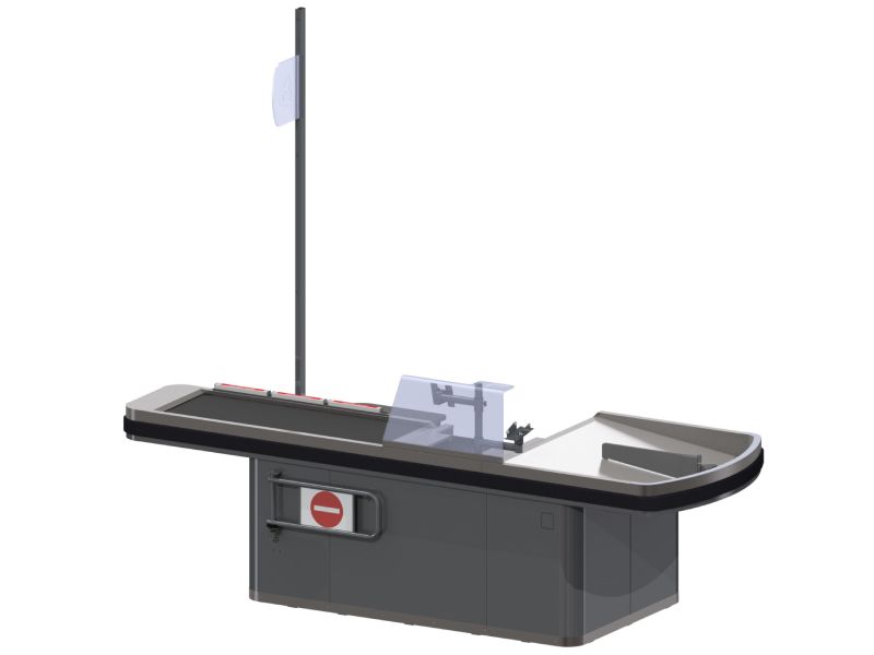 Pleksi steklo, nosilec POS terminala in monitorja, delilnik v predalniku, nosilec zaslona, pleksi zaščita tiskalnika, visoka škatla za cigarete, predali za cigarete, dodatna polica v srednjem delu, vrata osrednjega stojala, police za vrečke, zapornica, letvica naslednji kupec, predali za denar